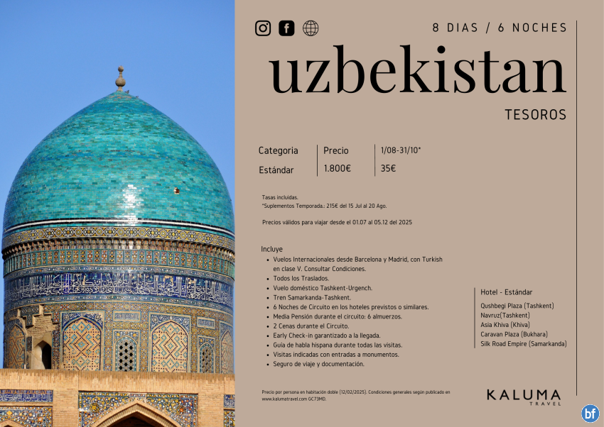 Tesoros de Uzbekistan 8 Días / 6 Noches + *Early Check-in garantizado* hasta Diciembre desde 1.800 €